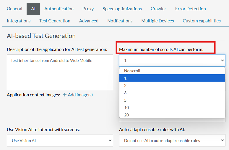 This feature provides greater control over AI-driven interactions, enabling users to set scrolling behavior to suit specific testing scenarios. By adjusting the scroll limits, you can optimize test execution, reduce unnecessary interactions, and improve the overall efficiency of your automated testing processes.