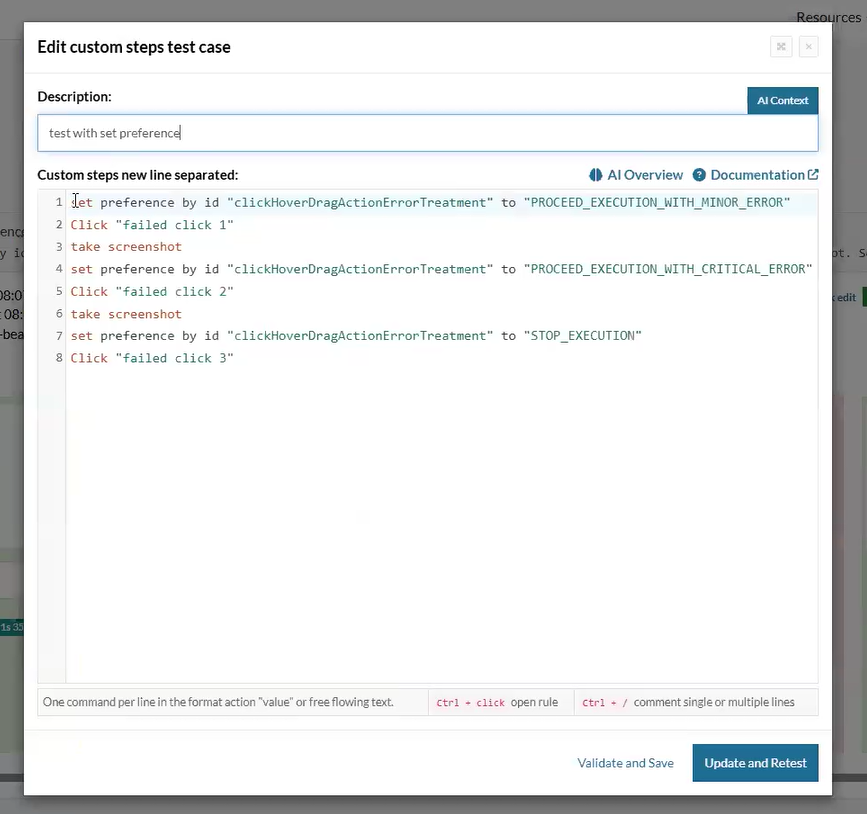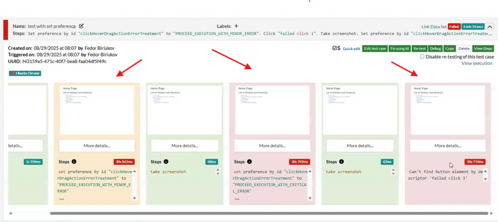These options allow flexible handling of errors based on their severity and testing needs. You can view error statuses during test case execution and update preferences dynamically using the “set preference by ID” command. Additionally, the error handling settings are available for review and configuration on the dedicated Error section page.