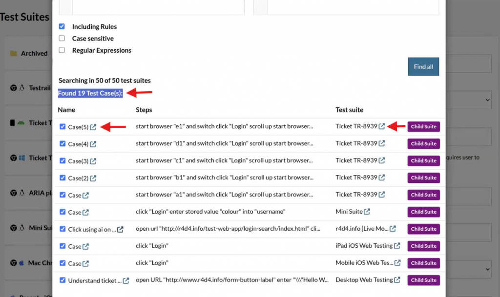 • Test Suite Context: The search results now display the associated Test Suite name alongside each Test Case or Reusable Rule (RR), providing greater context and clarity for every match. This ensures you always know exactly where each instance is located, making large-scale updates more manageable and reducing the risk of errors.