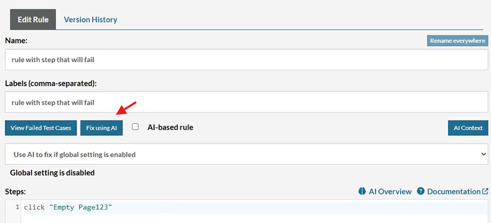 Caption: Fix errors using AI in reusable rules.