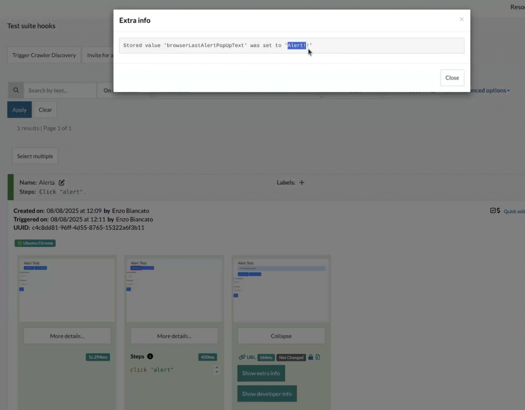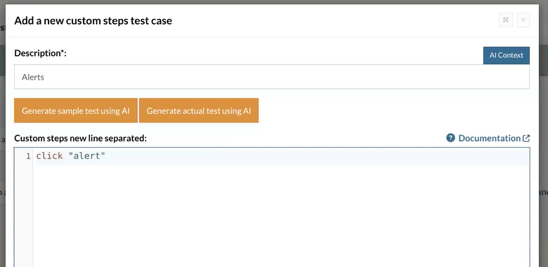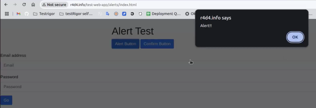 testRigor now improves popup validation by automatically closing popup windows in desktop web browsers. For example, on a sample page generating browser alerts, you can create a test case in testRigor to interact with the “Alert” button seamlessly.