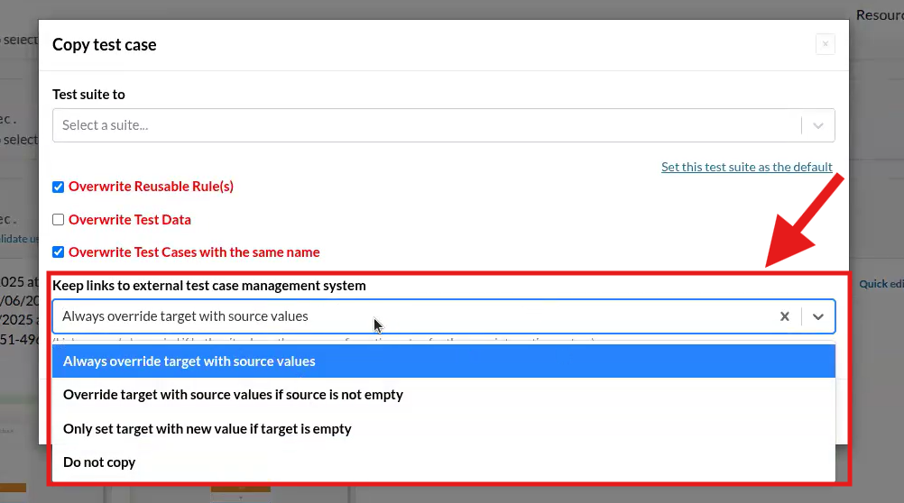 testRigor has improved the process of copying test cases between test suites by ensuring that links to external test case management systems (such as Azure DevOps, TestRail, Zephyr, and others) are now preserved. Previously, these links were only copied when a test case was newly created; copying existing test cases between suites did not retain the management system links.