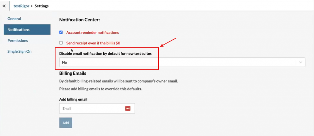 testRigor has introduced a new setting to disable email notifications by default when creating new test suites. This improvement allows organizations to control notification preferences centrally under Settings -> Notifications, within the company settings.