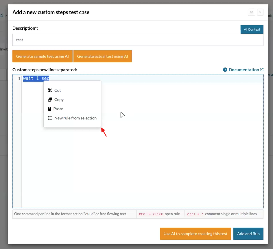testRigor now enables users to refactor selected lines of test steps into reusable rules directly from the editor. When a user selects any text and right-clicks, a custom context menu appears with the option “New Rule from Selection.”