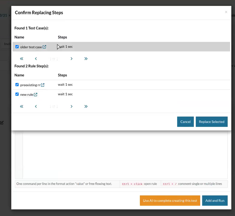 Once chosen, the selected steps are displayed inside a non-editable StepsEditor for review. The original selection is immediately replaced by the newly created rule. If a specific checkbox option is enabled, testRigor automatically searches through all existing test cases and rules, replacing every occurrence of the selected steps with the new rule and prompting the user with a replacement popup for confirmation.