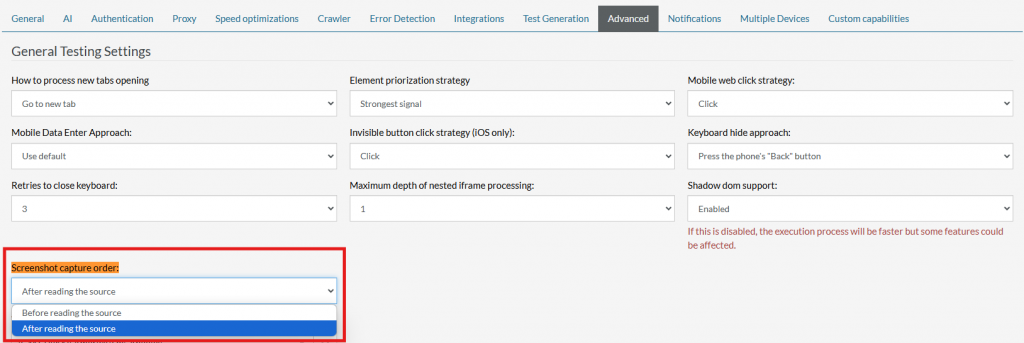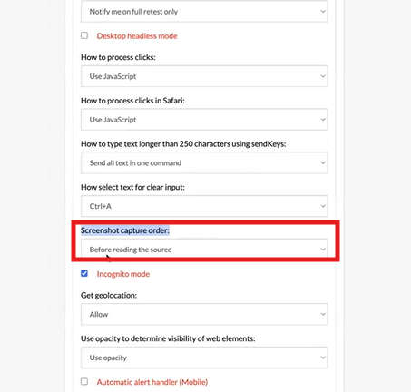 To modify the screenshot capture order, navigate to Settings -> Advanced -> Screenshot Capture Order within your Test Suite. You can choose between two options: