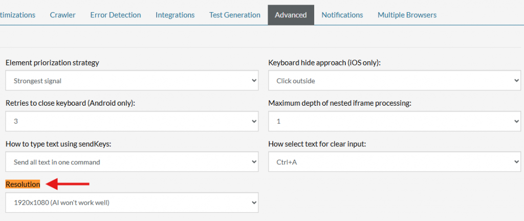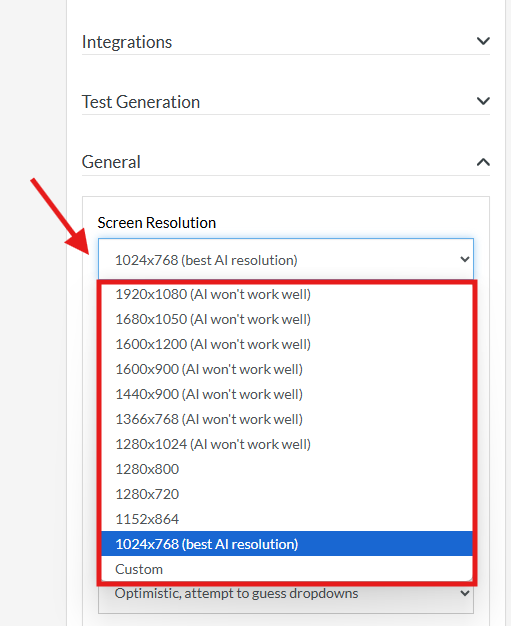 We are excited to announce the introduction of customizable screen resolution settings designed to optimize AI reliability for your web and desktop testing needs. Users can now select the most suitable screen resolution that aligns with their specific requirements and enhances the effectiveness of AI commands.