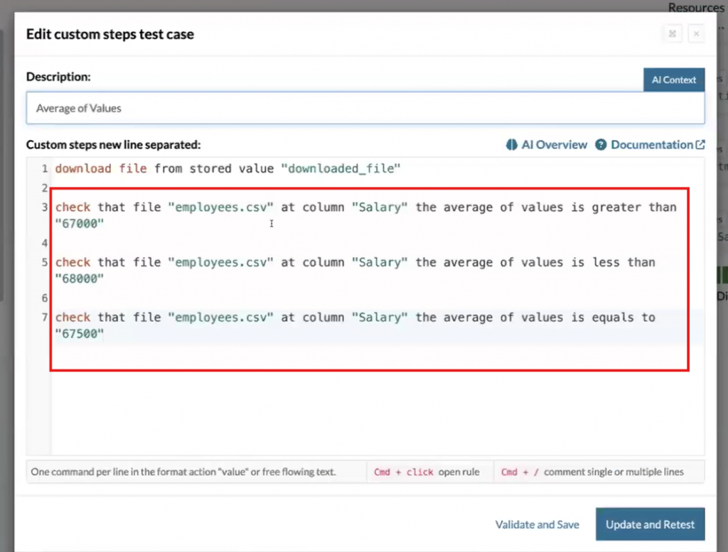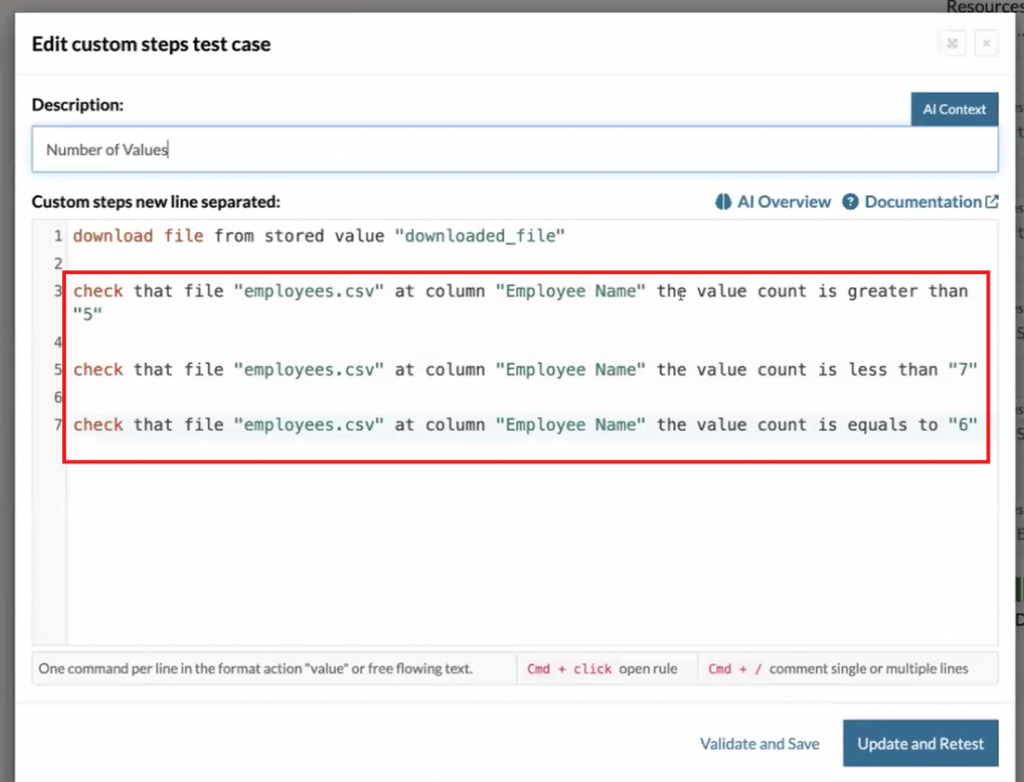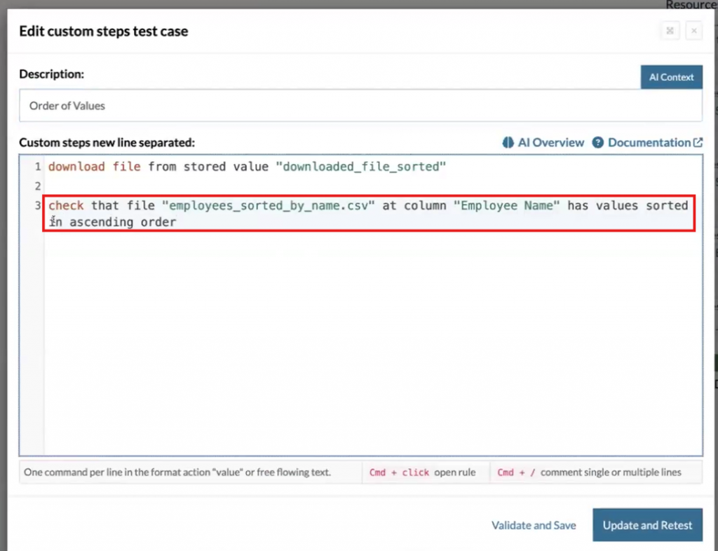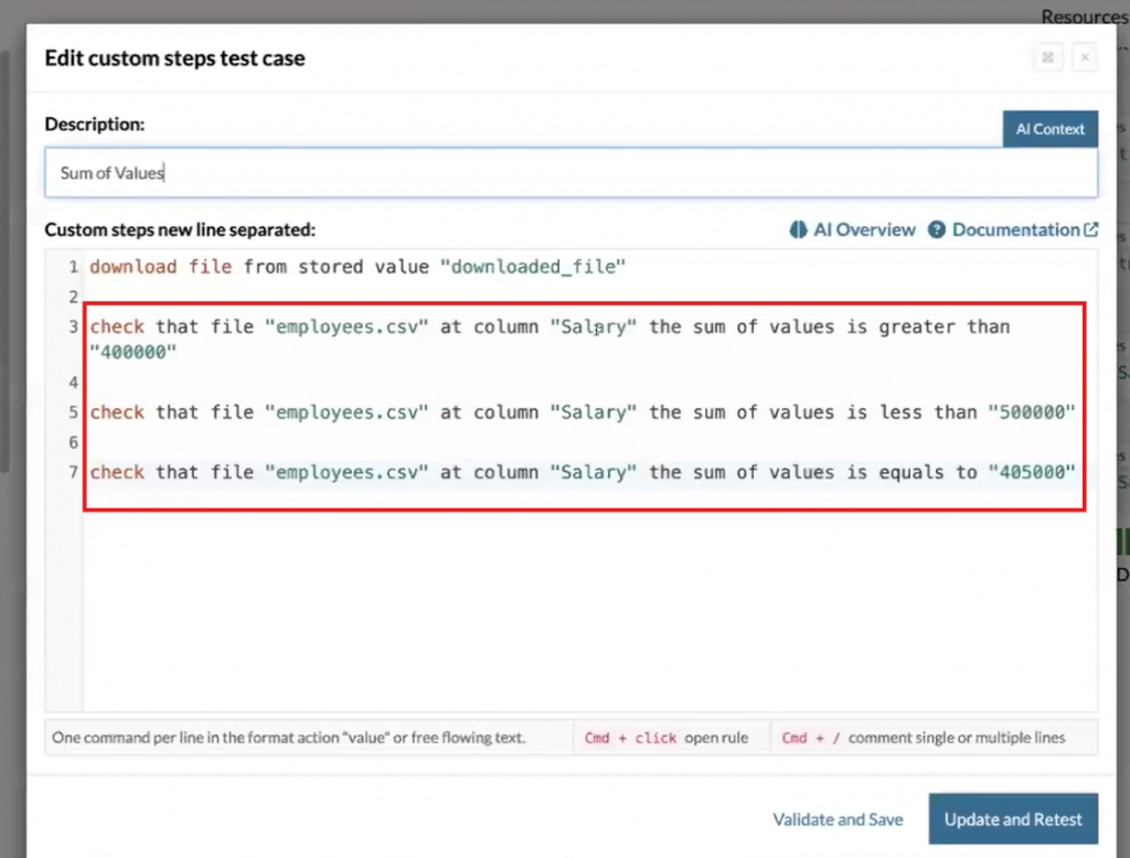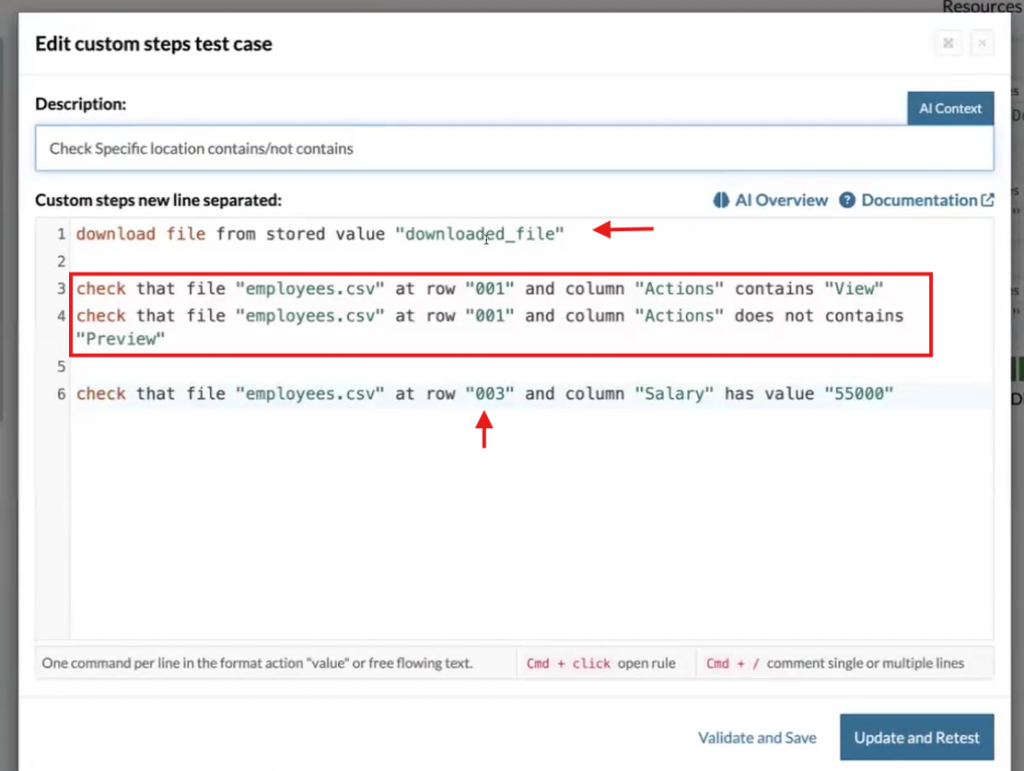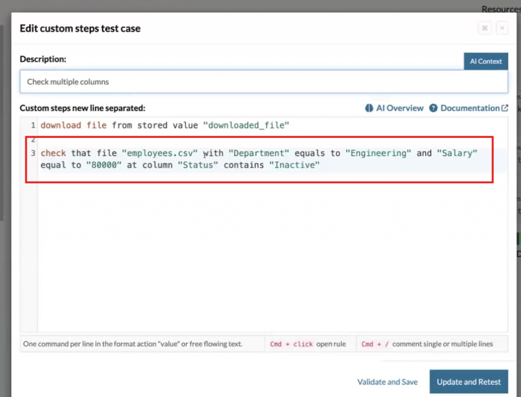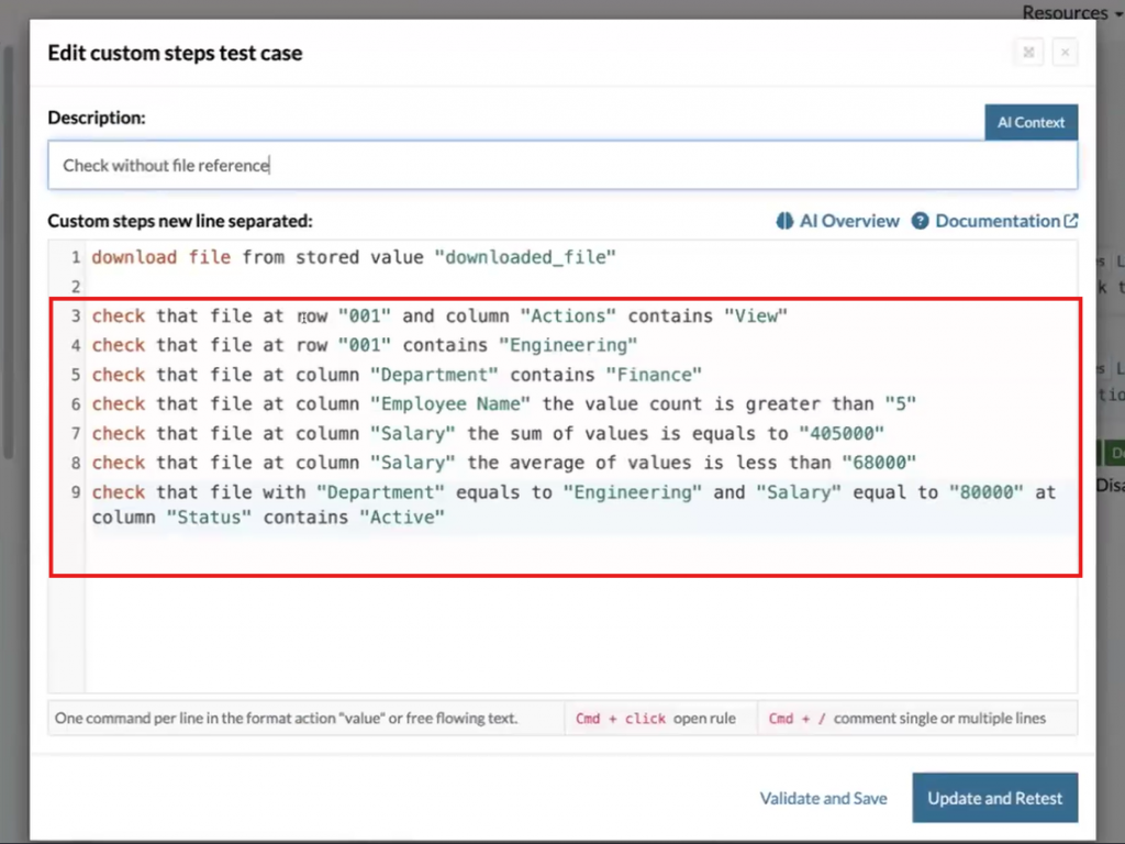Now, users can validate spreadsheet files as tables, applying the same thorough checks used for web tables directly to spreadsheet data. Instead of manually downloading and reviewing files, validation happens automatically at the file level, such as inspecting specific rows and columns (e.g., row 1, column “Actions”).