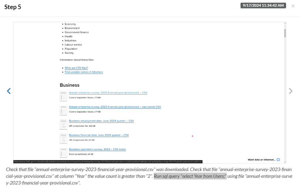 Caption: A screenshot taken from testRigor where a CSV file is downloaded and an SQL query pertaining to the file is performed. (Above)