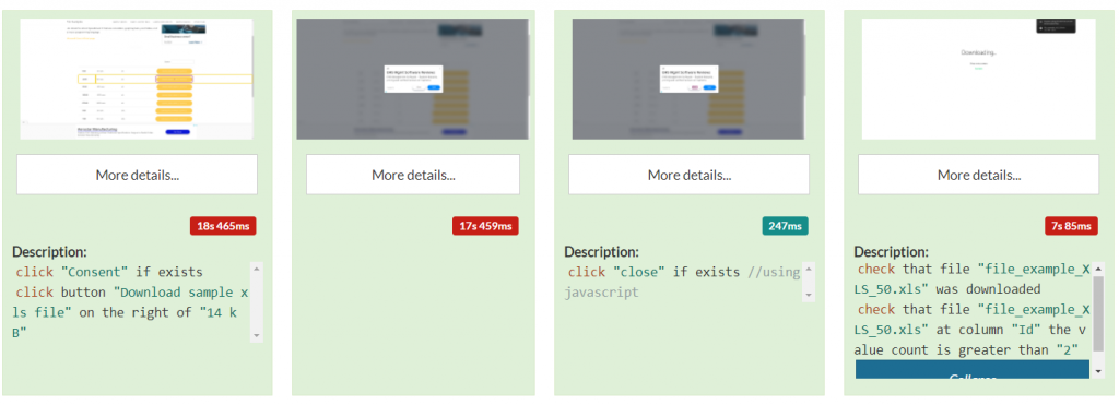 Caption: Screenshots displaying testRigor’s ability to download an xls file and validate the count of the values in a column. (Above)